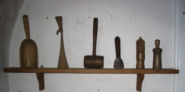 Utensili da cucina in legno: paletta per farina, schiacciapatate, martello per lardo, raschietto, tappatrici
